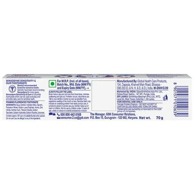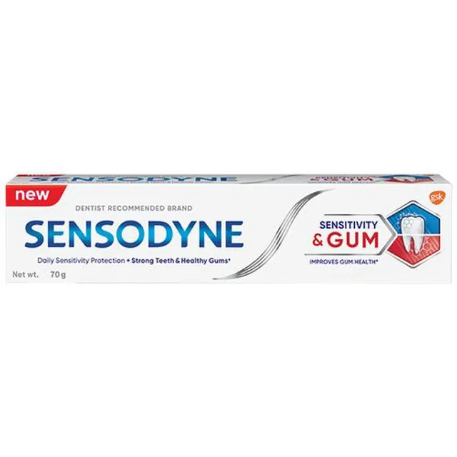 Often, tooth sensitivity and gum problems go hand in hand. When the protective layer of teeth (enamel) is worn away or gums recede, the dentine underneath becomes exposed. When the exposed dentine comes in contact with hot, cold, sweet or sour food and drinks, it can trigger a sharp short sensation called tooth sensitivity. Meanwhile, Gum problems are caused by a build-up of plaque bacteria. Sensodyne Sensitivity & Gum is a daily fluoride toothpaste that helps protect against tooth sensitivity and improves gum health, while still providing the benefits of a regular paste. This toothpaste has a low abrasion, dual action formula. It protects the teeth against sensitivity and helps target & remove plaque bacterial for healthy gums. With twice daily brushing, you can enjoy your favorite foods and drinks without the worry of sensitive teeth. Sensodyne Sensitivity & Gum tooth paste is available in two packs - 70 gm and 140 gm (70 gm * 2) combo pack. Always follow instructions and guidance included on the pack before use.