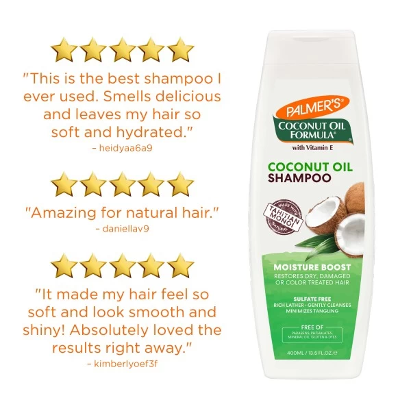 Palmer's® Coconut Oil Formula Moisture Boost system restores hair experiencing dryness or damage with natural reparatives that instantly and deeply lock in moisture from root to tip, visibly improving your hair’s condition after each use.