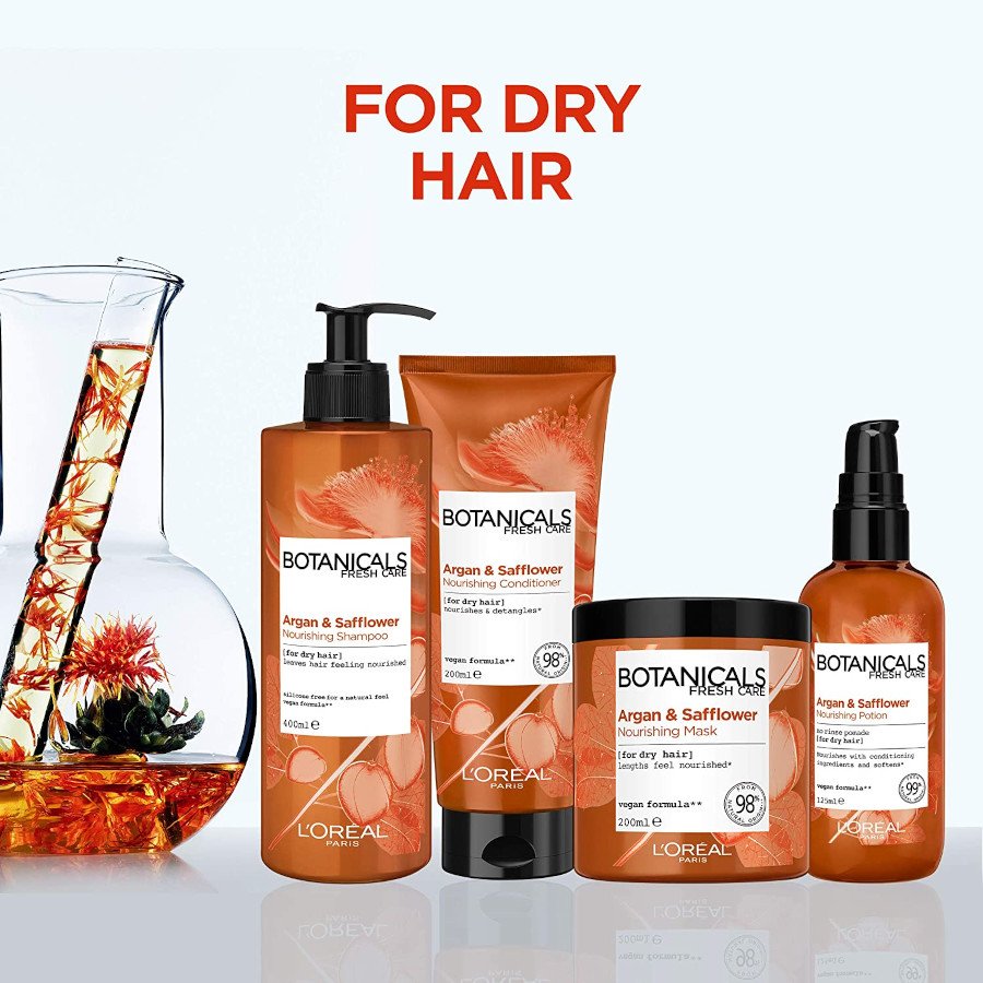Introducing our L'Oréal botanicals safflower nourishing conditioner for dry hair. Argan & safflower a nourishing therapy for your dry hair. Rich in lipids, we've infused these precious oils in opulent formulas that Drench hair in nutrition and moisture. Our botanicals hair philosophy 100% vegan our formulas don't contain any animal component or derived ingredients. Natural formulas our conditioners & treatments are crafted with at least 97% naturally derived ingredients. No silicones for a natural feel. Recycled & recyclable packaging all our Shampoo & treatment bottles are made of 100% recycled pet. Our conditioner Tubes are 50% recycled. All our packaging is 100% recyclable, except the caps- we're not perfect but we're working on it! It's a journey but we're committed to constantly improving our sustainability credentials. After you Shampoo, apply onto wet hair and leave for 2 minutes. Rinse thoroughly. In case of contact with eyes, rinse them immediately and thoroughly.